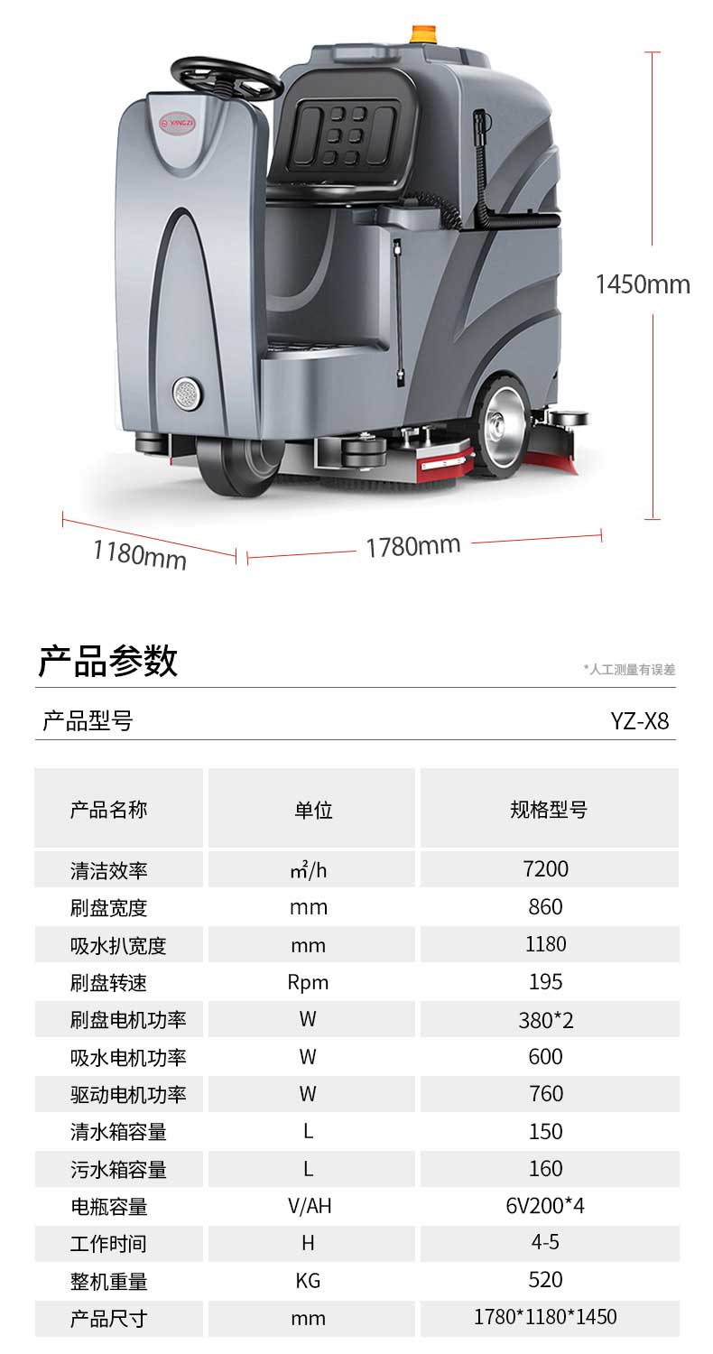 扬子YZ-X8驾驶式洗地机,拖地机,厂家直销,省30%成本,工作时间:4-5小时,重量:520kg,效率:7200m2/h,大于20人工作效率,干净不留痕,免费试机,买贵包退.专业的售后团队,免费上门指导操作和维护.扬子YZ-X8分:免维护款和锂电款,想进一步了解,请咨询在线客服或拨打官方免费热线,客服详细解答产品参数和最新活动价格